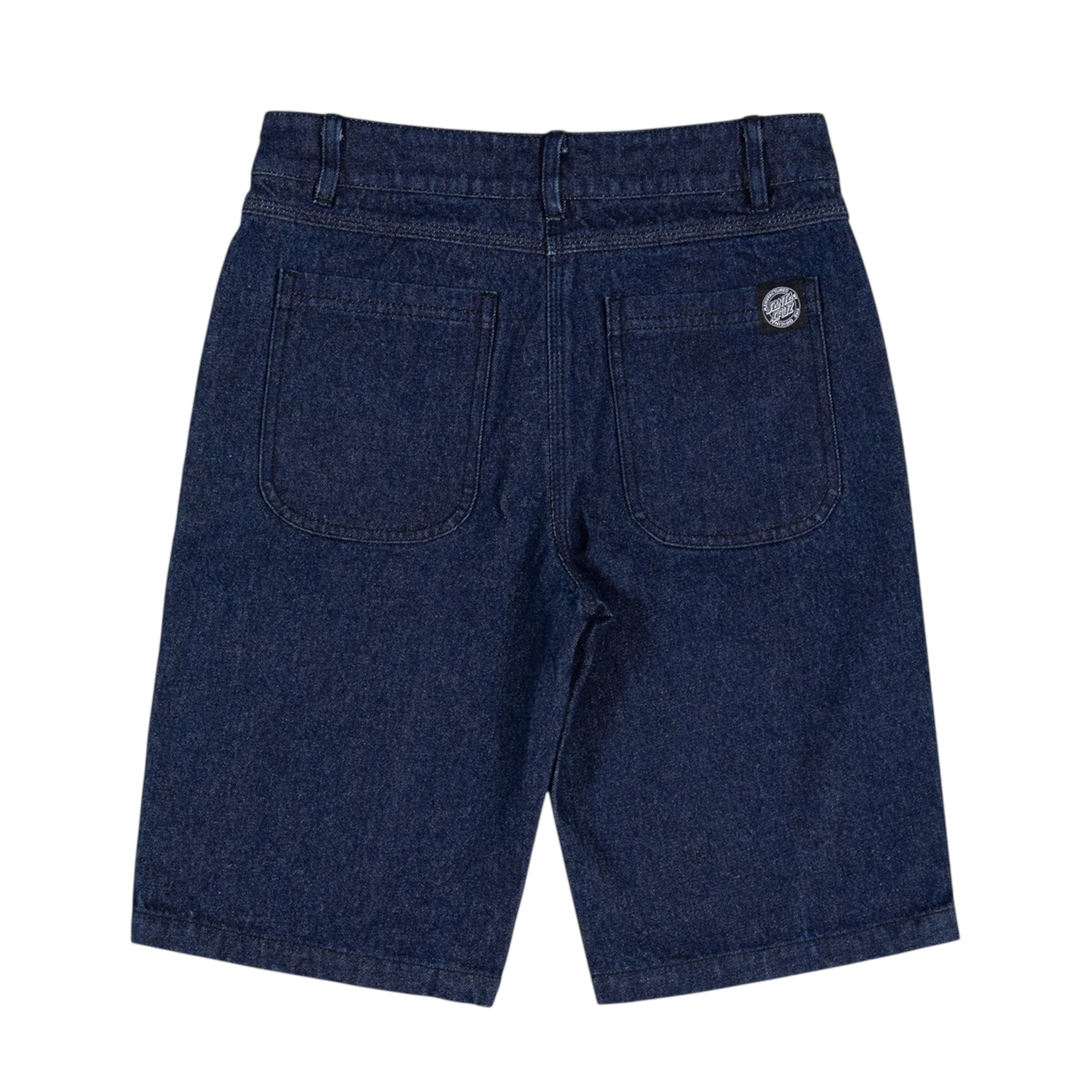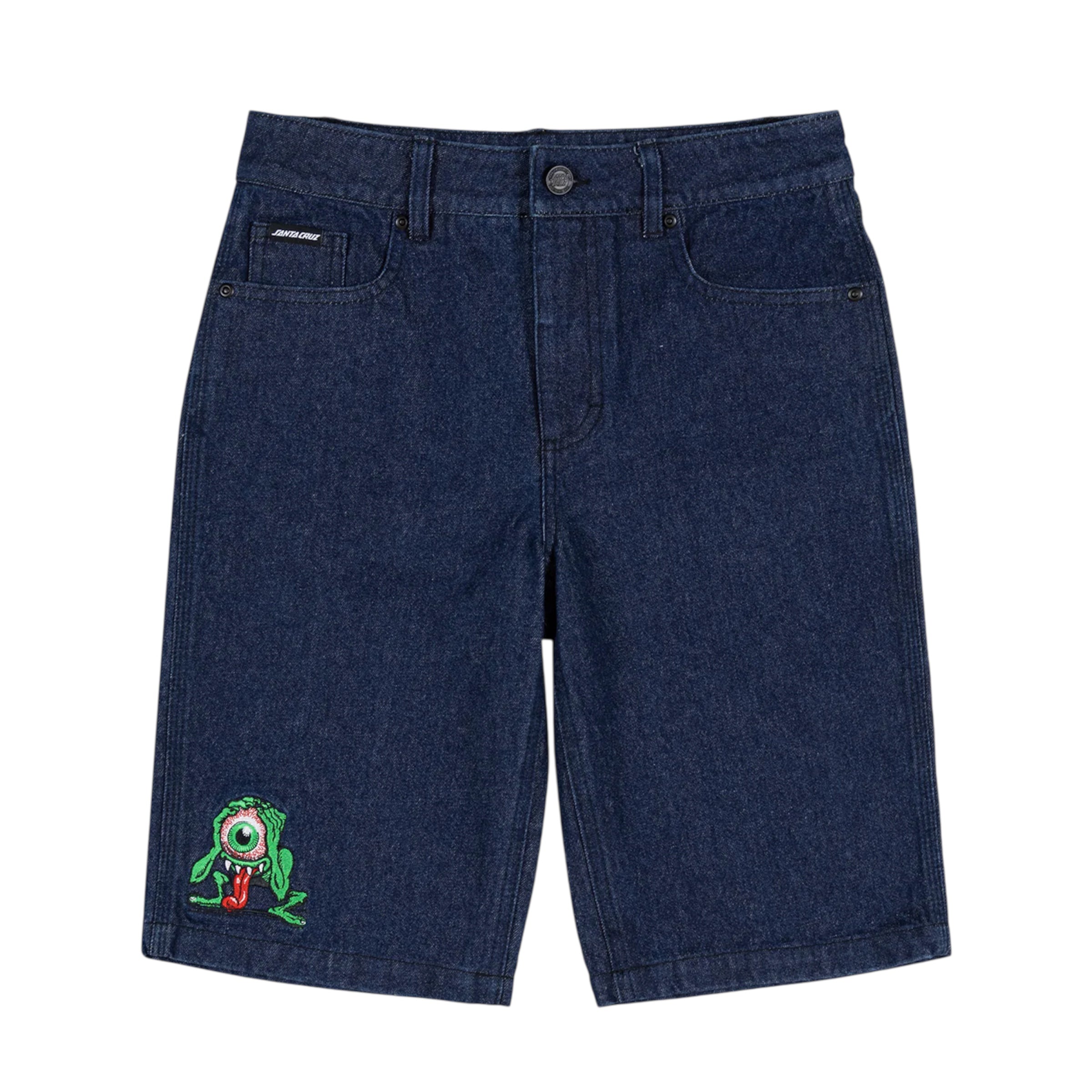 Boys Santa Cruz jean shorts featuring woven label of the Eyegore artwork.